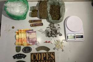 A ação resultou na apreensão de uma barra de 512 gramas de maconha prensada, 45 bombinhas da mesma droga, dois pinos e um papelote de cocaína, 63 pedras de crack e uma balança de precisão.