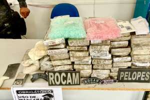 Após bater o carro, o condutor empreendeu fuga pelo matagal, não sendo encontrado pelos polícias. Ao realizar vistoria no interior do veículo, os militares encontraram 40kg de maconha, 120g de cocaína, 190g de crack, 2 mil pinos para embalagem de cocaína, uma balança de precisão e um cutelo (faca utilizada para fatiar a droga).