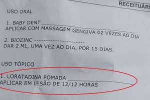 Segundo o pai, que preferiu não se identificar, a mãe do bebê o levou para atendimento médico neste domingo, 30, e a médica que atendeu a criança receitou alguns medicamentos, entre os quais estava escrito: 'Loratadina pomada - aplicar em lesão de 12 em 12 horas".